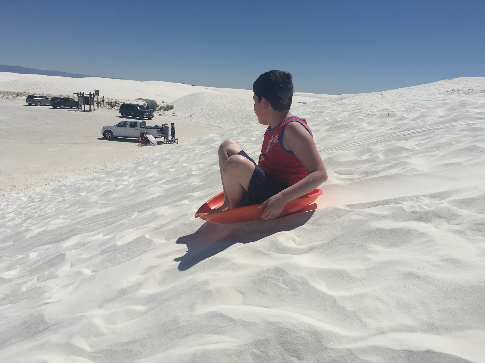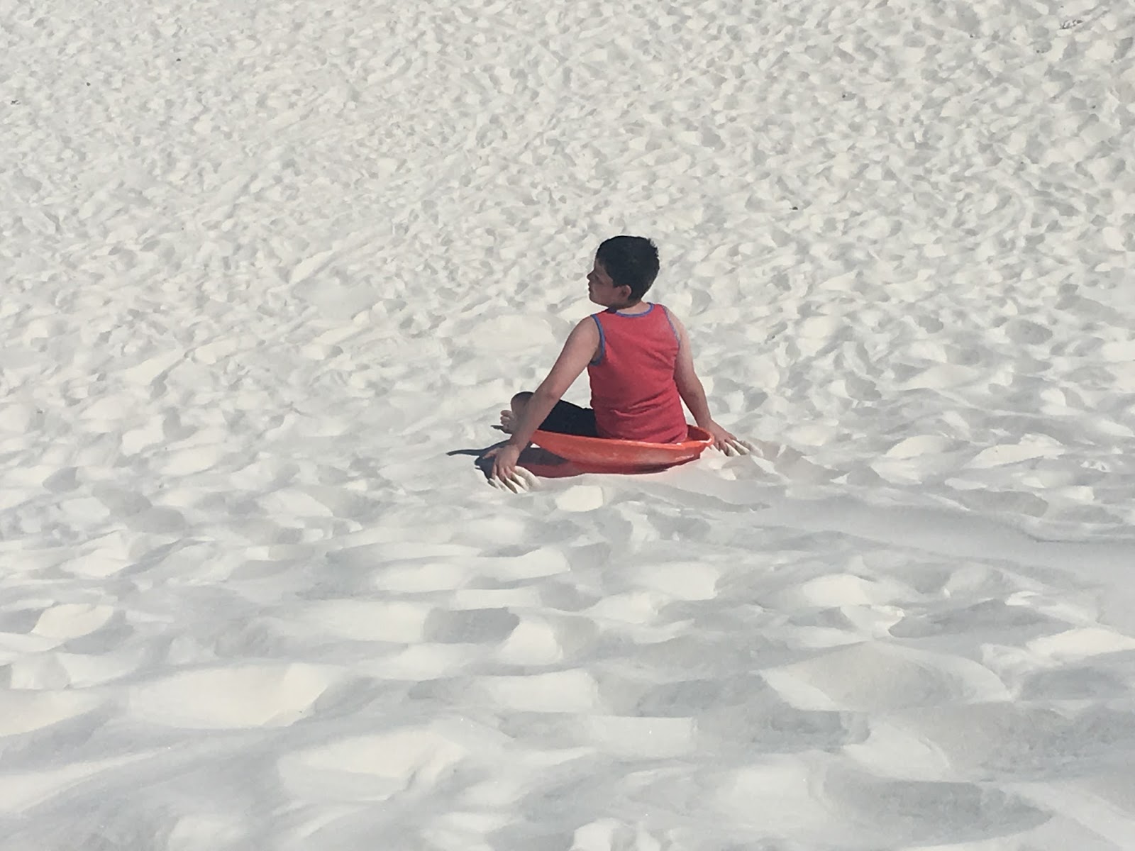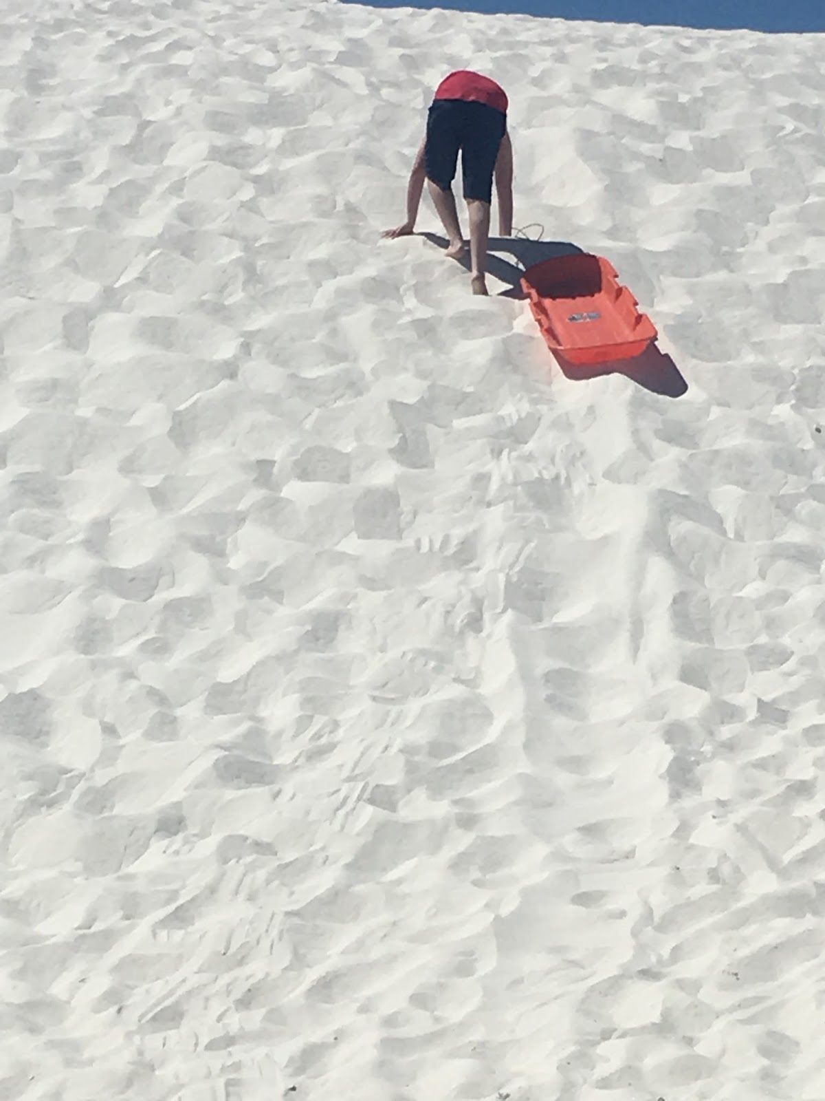 Then we went to White Sands.  The dunes are beautiful and cool to your feet.  The hard part is climbing up the dune to go down on your sled.  When Caeleb was about 2, we took our eyes away for a second and before we knew it he was at the top of the dune dragging his orange sled ready to go down.  And down he went, giggling the entire way, rosy red cheeks and sand everywhere…I mean everywhere.  My fearless warrior is a risk taker.  This time going up the dunes was a bit harder for him.  His right knee and ankle don’t always work like he wants them to due to repeated bleeds, but he forged ahead, made it to the top and sled down, time after time.